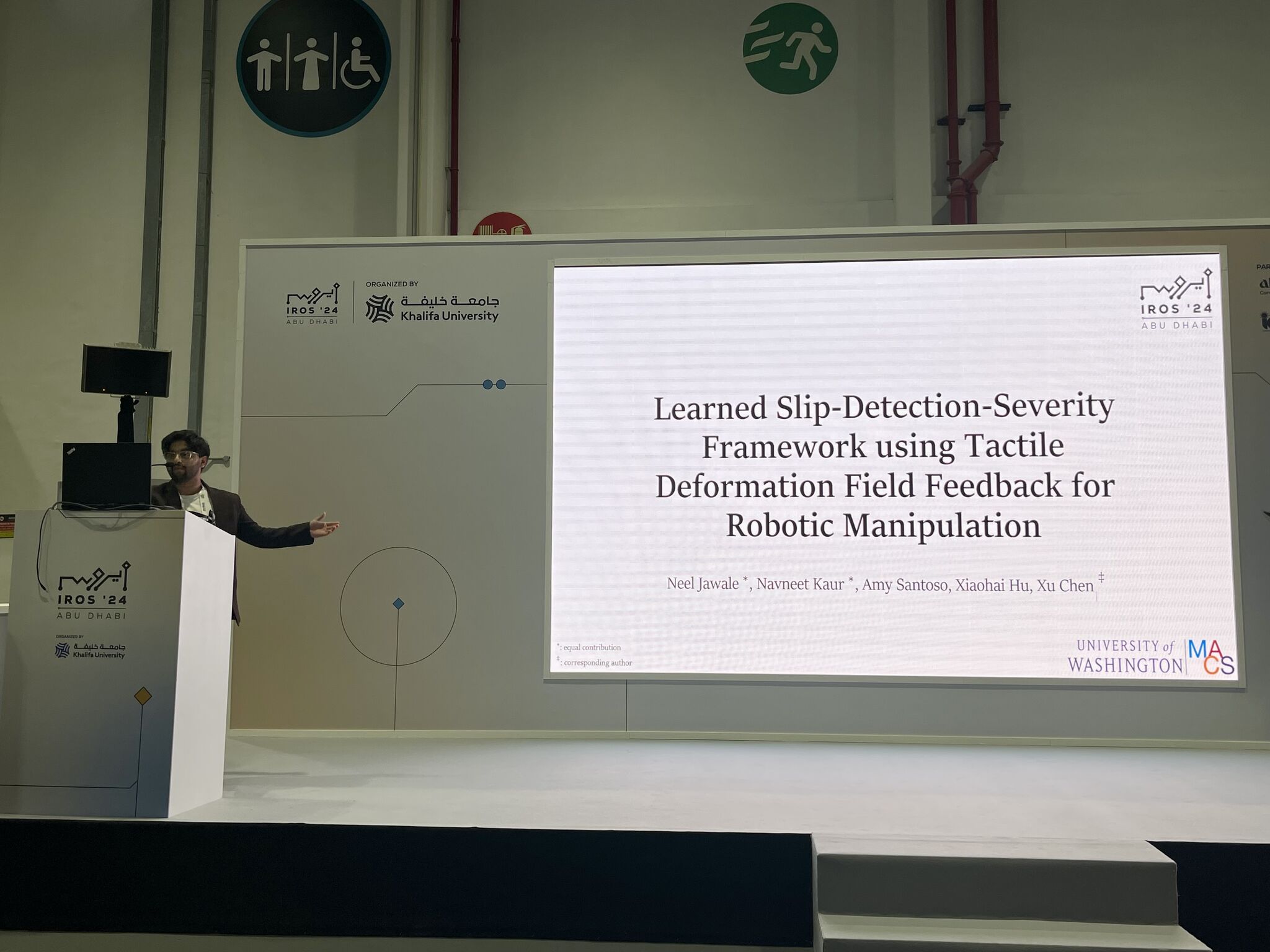 Excited that our slip detection and robotic grasping work were presented as a regular paper there. Safely handling objects and avoiding slippage are fundamental challenges in robotic manipulation, yet traditional techniques often oversimplify the issue by treating slippage as a binary occurrence. Our research presents a framework that both identifies slip incidents and measures their severity. We introduce a set of features based on detailed vector field analysis of tactile deformation data captured by the GelSight Mini sensor. Two distinct machine learning models use these features: one focuses on slip detection, and the other on evaluating the slip’s severity which is the slipping velocity of the object against the sensor surface. Our slip detection model achieves an average accuracy of 92%, and the slip severity estimation model exhibits a mean absolute error (MAE) of 0.6 cm per second for unseen objects. To demonstrate the synergistic approach of this framework, we employ both of these models in tactile feedback-guided vertical sliding tasks. Leveraging the high accuracy of slip detection, we utilize it as the foundational and corrective model and integrate the slip severity score into the feedback control loop to address slips without overcompensating.